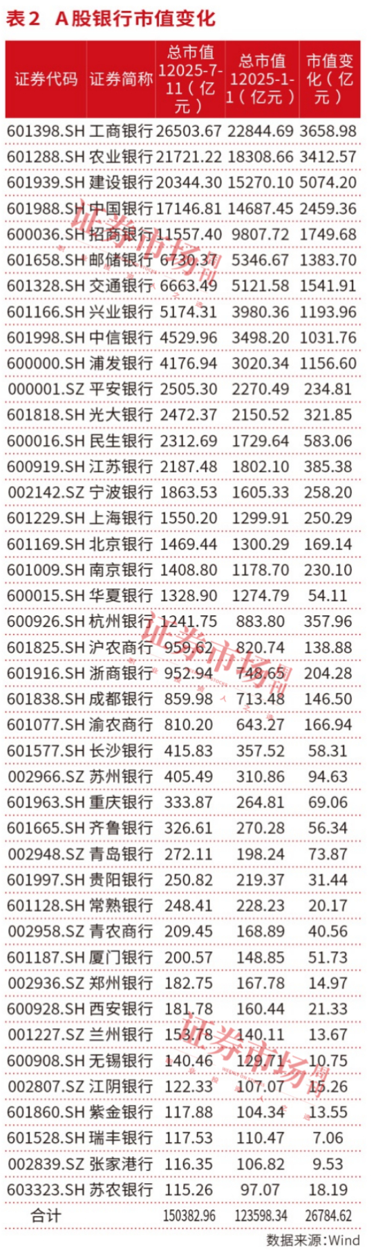 从市值的绝对值来看,截至7月17日,A股银行总市值相较2024年末上涨了21716.94亿元,背后既有银行股价上涨的作用,也有国有行增发以及城商行债转股因素带来的股本总量提升的因素。