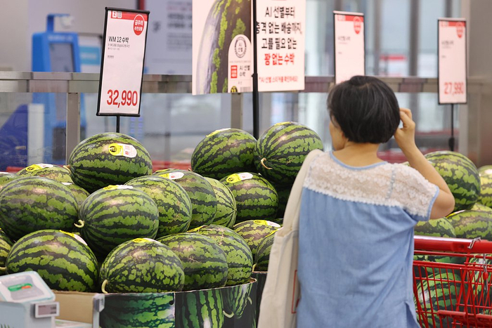 当地时间2025年7月21日,韩国首尔,一家大型超市的水果销售区,市民正在购物。高温和暴雨灾害导致水果和蔬菜价格上涨。