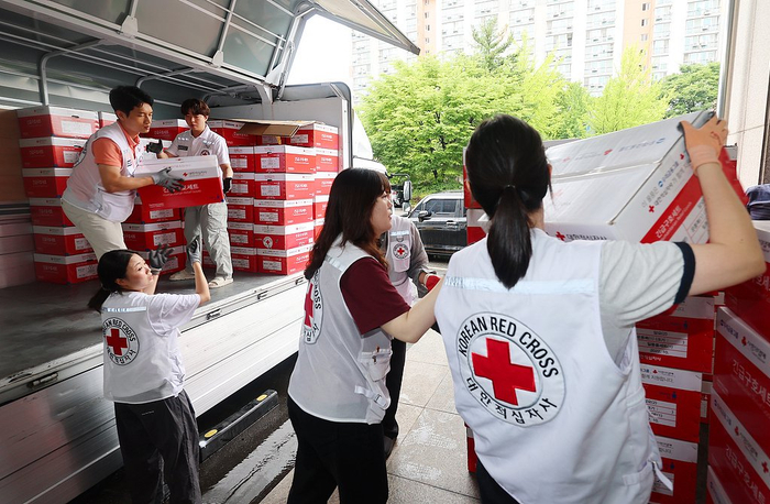 当地时间2025年7月18日,韩国仁川,红十字会工作人员正在搬运紧急救援物资,这些物资将送往忠清南道受强降雨影响的灾民手中。