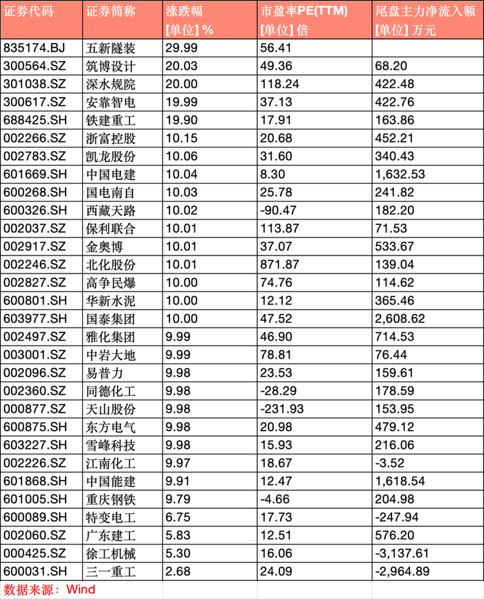 大基建板块集体爆发,雅江电站概念、工程机械、钢铁、电网设备等板块涨幅居前,截至A股收盘,西藏、水利板块全线爆发,中国能建、中国电建、保利联合、西藏天路、高争民爆等多股一字涨停。水泥、基建等方向也发力补涨,青松建化、中交设计、上峰水泥、天山股份、狮头股份、中铁工业、成都路桥等逾30股涨停或涨超10%。