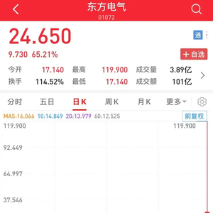 尽管该笔疑似“乌龙指”在市场的修正下股价回落,但港股东方电气今日全天仍维持强势,截至收盘,港股东方电气最终以24.65港元/股报收,股价涨幅达65.21%。