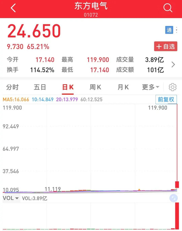港股市场东方电气今日刷屏,该股最高涨至119.9港元/股,较前一个交易日收盘价上涨超700%。分析人士认为,这可能是一笔乌龙指,交易员原本或许想以19.9港元/股买入,却误输入为119.9港元/股。不过,这笔单子并不大。