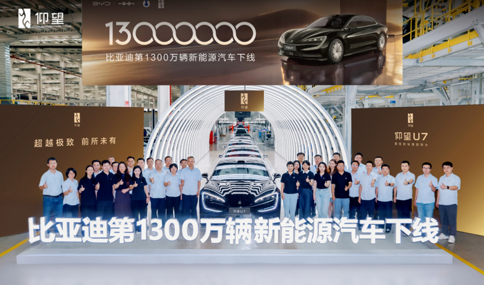 更值得玩味的是,第1300万辆车并非一款走量的家用车型,而是售价62.8万—70.8 万元的仰望U7。这种“用旗舰车型纪念里程碑”的操作,藏着比亚迪最真实的野心:不仅要做销量冠军,更要撕掉“性价比”标签,在高端市场与BBA正面抗衡。