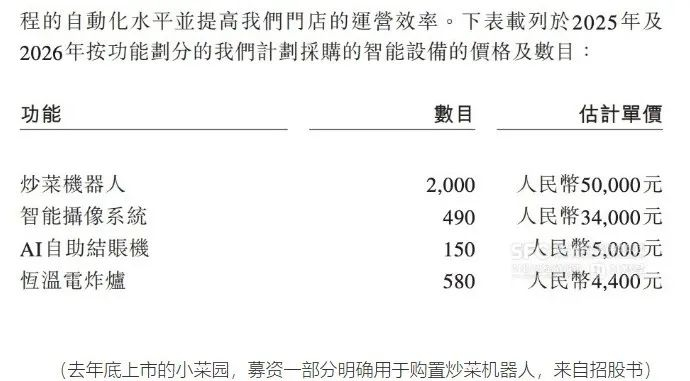 660多家门店的小菜园,年营收在52亿左右,于2024年末赴港上市,即准备用1亿元采购2000台炒菜机器人,一台单价5万元。