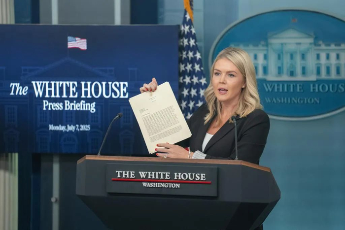 7月7日,白宫新闻发言人卡罗琳·莱维特在记者会上展示美国总统特朗普致日本首相的信函。信中称美国将自8月1日起对日本输美商品加征25%“对等关税”。新华社发