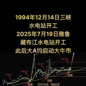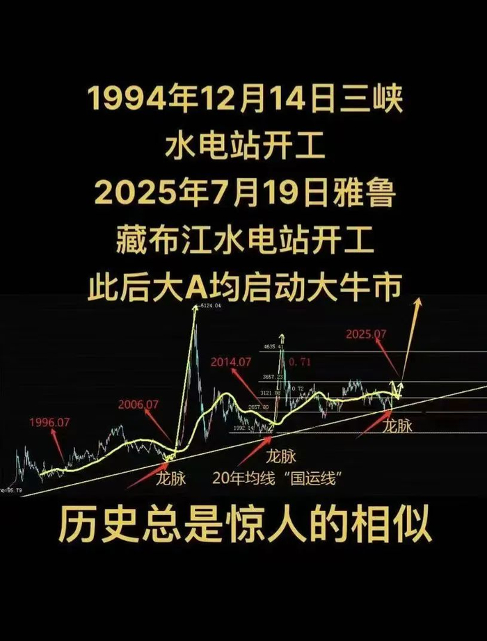 比如三峡水电站开工其实是1994年,在这个图的最左侧,而第一轮大牛市上涨开始于2007年,这中间隔了13年,这个图把两个没法关系的事件搭在一起,视觉冲击很大。