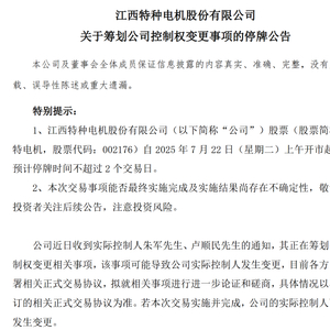 江特电机在《关于筹划公司控制权变更事项的停牌公告》中披露,公司近日收到实际控制人朱军、卢顺民的通知,二人正在筹划涉及公司控制权变更的相关事项,该事项可能导致公司实际控制人发生变更。不过,截至公告发布时,各方尚未签署相关正式交易协议,仍需就具体细节进一步论证和磋商,最终结果以正式协议为准。