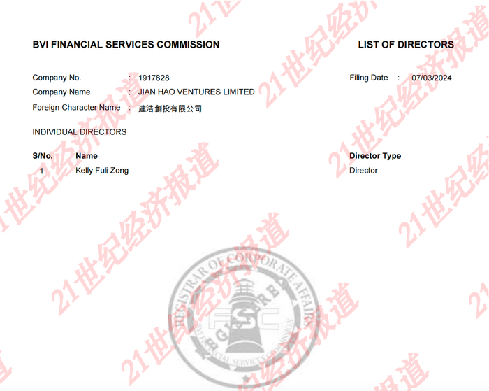 7月21日,21世纪经济报道记者从英属维京群岛金融服务委员会查询得知,娃哈哈争产案第二被告Jian Hao Ventures Limited(建浩创投有限公司)的唯一董事为宗馥莉。该决议及同意任职书最后存档的日期为2024年3月7日。