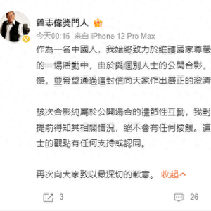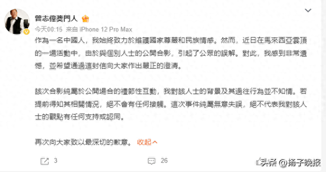 7月21日凌晨,曾志伟发声明澄清近期争议:作为一名中国人,我始终致力于维护国家尊严和民族情感。然而,近日在马来西亚云顶的一场活动中,由于与个别人士的公开合影,引起了公众的误解。对此感到非常遗憾,并希望向大家作出严正的澄清。