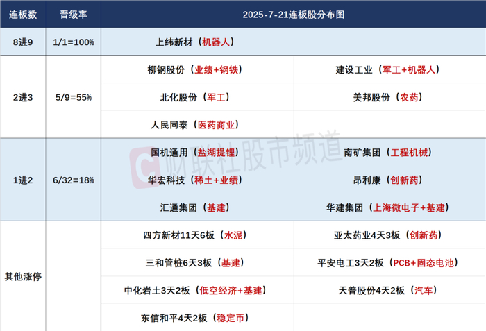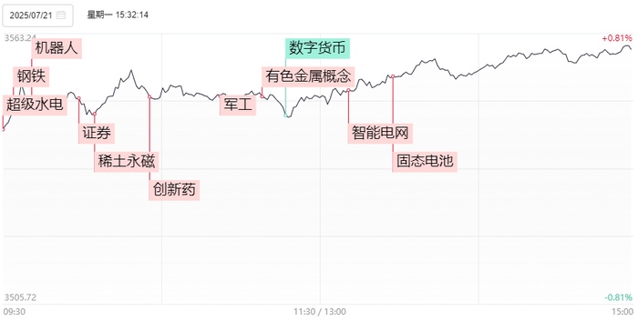 指数高开高走,午后震荡上扬。截至收盘,沪指涨0.72%、创业板指涨0.87%均创年内新高,深证成指涨0.86%。两市个股涨多跌少,上涨个股超4000只,逾百股涨停;两市全天成交1.7万亿元,较上一日放量成交1289亿元,内资主力资金净流出106.6亿元;两市涨跌中位数为0.89%。盘面上,市场整体维持着相对良性的轮动结构。雅下水电概念全线爆发,带领大基建板块掀起涨停潮。民爆、西藏、水泥、水利建设、钢铁等方向全天领涨,五新隧装、中国电建、西藏天路等几十股涨停;机器人板块盘中走强,长盛轴承涨停;稀土、有色金属板块再度活跃,闽发铝业等涨停;固态电池概念午后走高,索通发展涨停;海南板块震荡上行,海南瑞泽一度涨停;PCB概念午后回暖,中材科技涨停;有机硅、医药、化工、猪肉、军工等板块表现亮眼。跌幅方面,保险、银行股回调,厦门银行领跌;稳定币、跨境支付概念走低,四方精创跌近8%;光刻机、华为海思等芯片股集体下挫,AI语料、AI智能体、多模态等AI应用概念走弱,5G、信创等方向飘绿。消息面上1、世界级工程来了!1.2万亿雅鲁藏布江下游水电工程开工;2、宇树科技开启上市辅导;优必选中标人形机器人领域最大采购订单;3、外媒:6月份中国对美稀土磁体出口激增,飙升至5月的7倍以上;4、香港金融发展局主席洪丕正称,稳定币不应作为短期炒作工具,8月将启动监管制度。