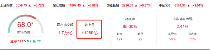 1、沪指放量上涨0.72%、创指涨0.87%双双创年内新高 全市场逾百股涨停 大基建板块全线爆发