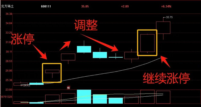 现在很多趋势票,都是找大块头,板块爆发的第一天也会涨停,加速后调整几天,然后再轮动起第二波加速,看北方稀土就是这种图形。