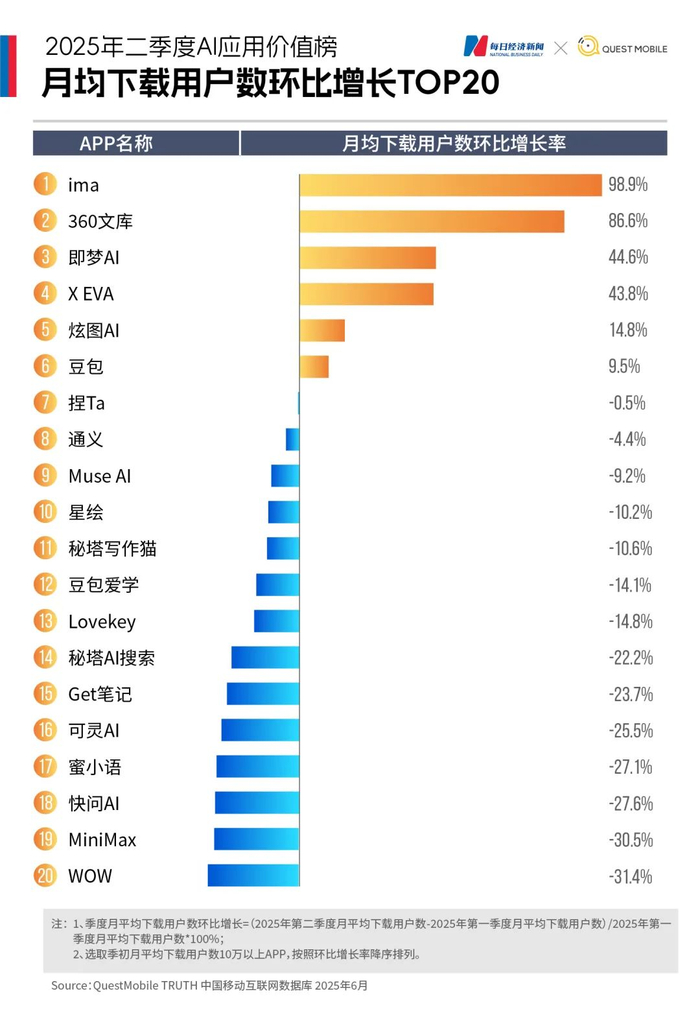 《每日经济新闻》联合QuestMobile推出《2025年二季度AI应用价值榜》,基于月均下载量与月活跃用户数(MAU)两大核心指标,揭示AI应用“中场战事”的新变局。