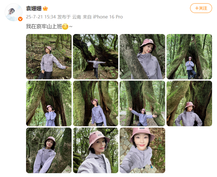 7月21日下午,演员袁姗姗在个人微博发布多张照片并配文称:我在哀牢山上班。其IP地址显示在云南。