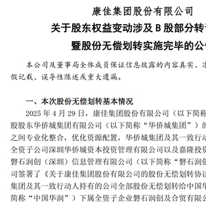 7月21日,康佳集团B股股份无偿划转工作已完成,本次股份无偿划转实施完毕。磐石润创持有康佳集团约5.24亿股A股股份,占总股本的21.76%;合贸有限公司通过中信证券经纪(香港)有限公司持有康佳集团约1.98亿股B股股份,占总股本的8.24%。本次股份无偿划转完成后,康佳集团的控股股东将变更为磐石润创,实际控制人变更为中国华润,最终实际控制人仍为国务院国资委。