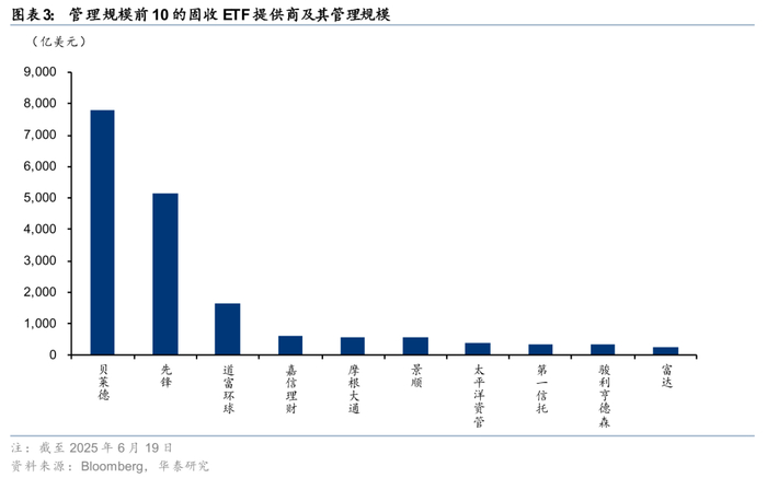 就管理人来看,截至2025年6月19日,美国固收ETF市场共113家管理人,但规模极为集中,前10家管理人管理着近90%规模的ETF固收资产,前三家贝莱德、先锋、道富管理着超74%规模的资产。特别是在被动型宽基产品上,存在明显的头部集中效应。