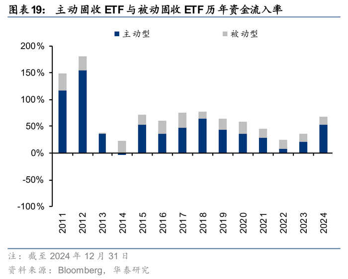 按照管理方式划分,被动型ETF发展较早,占据固收ETF市场主流,规模占比维持80%以上,但从近些年发展趋势来看,主动型固收ETF的数量和规模占比均持续提升,由2010年仅5只、规模不足15亿元,增长至2024年达到425只、规模突破2400亿美元。由于基数较小,主动型产品在多数年份的规模增长率与资金流入率均大幅领先于被动型,截至2024年,主动产品数量已超过被动产品,市场格局由“被动为主”转向“主动+被动”并重转变。