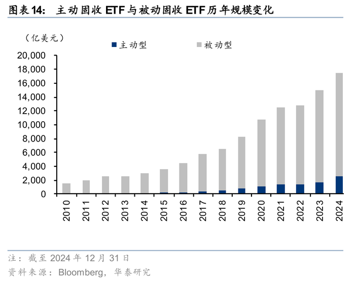 就管理方式来看,被动型ETF是固收ETF的主流,现规模占比超82%,存量规模排名前40的品种均为被动型产品,但规模相对集中,总数量约395只,占全部固收ETF数量不足一半,代表性产品包括Vanguard总债券市场ETF(BND)、iShares核心美国总债券ETF(AGG)等;主动型固收ETF旨在获取超越指数回报的收益,常依赖于量化投资模型,考虑宏观经济趋势,并对个券基本面进行分析,在部分年份可取得超额收益,规模相对分散,数量481只,数量占比约55%,但规模占比不足18%,规模较大的代表性产品包括JPMorgan超短期收入ETF(JPST)、Fidelity总债券ETF(FBND)等。