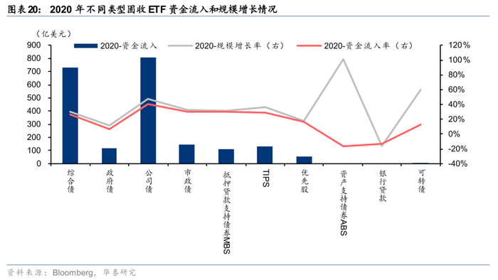 受新冠疫情影响,2020年3月美国金融市场流动性恶化,为了向市场提供流动性支持,美联储启用了二级市场公司信贷工具(SMCCF),通过SPV从二级市场购买符合条件的公司债ETF,公司债ETF成为资金流入最多的品种,其次为综合债。政府债、市政债、MBS、TIPS等产品的资金流入则显著次之。