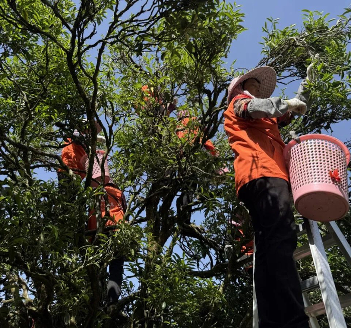 茶农从采青开始就很讲究了,单株单采,且只采春茶。经验丰富的采茶人拿着梯子爬上去,一天也就采得十来斤,采摘费时、费力。