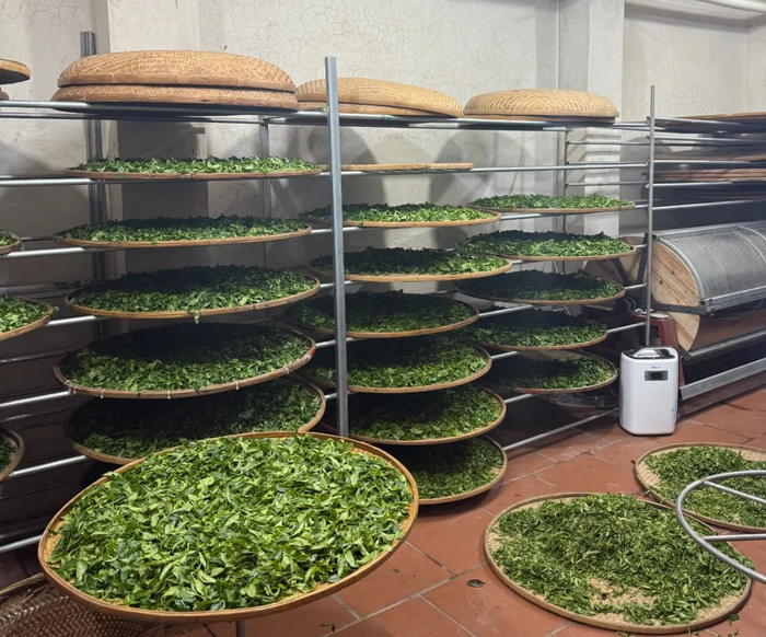 采摘下来的新鲜茶叶,需马上开始进入制作,争分夺秒。经过采青、晒青、做青、杀青、揉捻、烘焙六大工序,十余道工艺,方可制得。