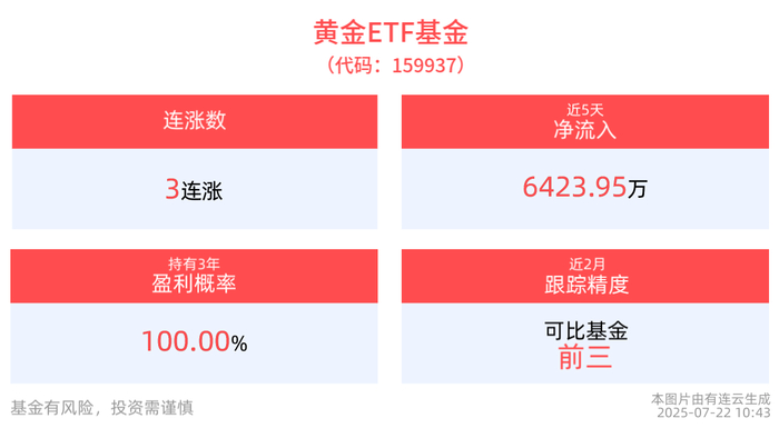 跟踪精度方面,截至2025年7月21日,黄金ETF基金近2月跟踪误差为0.002%,在可比基金中跟踪精度较高。