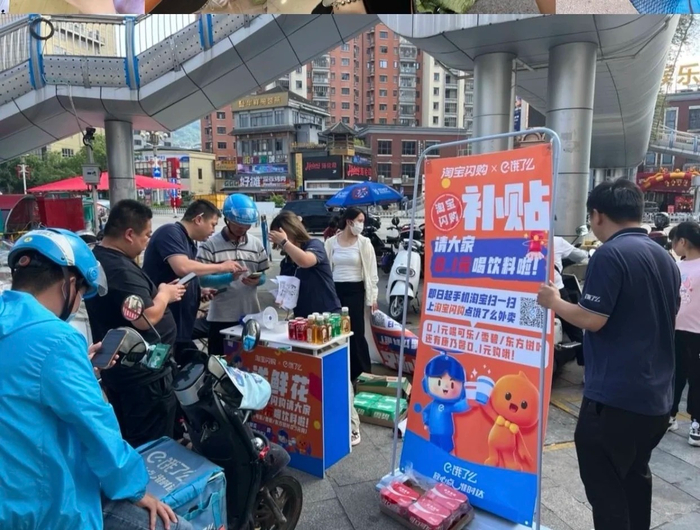 另外就是线下,有网友看淘闪工作人员在地铁站、街边“摆摊”,拉路人宣推,帮用户操作下单,开启"前摊后仓"模式——从仓库直接取饮料,门口摆摊,0.1元自提。参照1个点位一天100-200单估算,全国每天至少百万新增订单。