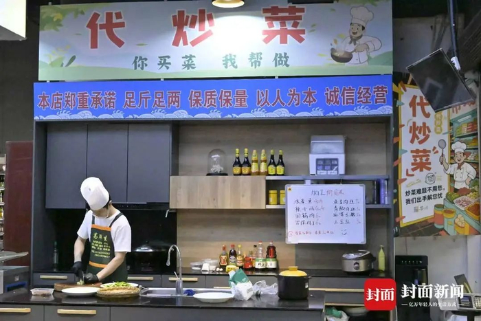 7月21日上午10时许,封面记者来到绵阳安州区卓信智慧农贸市场,一楼靠近公路的生鲜店门口竖着“代炒菜”的牌子。内容包括火锅加工、现炒火锅底料以及卤菜加工。顺着电梯口的小道往里走,代炒菜又增加了服务内容,除生鲜食材加工外,还提醒顾客只需要购买食材到店,就可以现场加工。