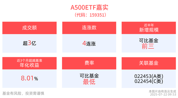 截至7月21日,A500ETF嘉实近6月净值上涨8.31%。从收益能力看,截至2025年7月21日,A500ETF嘉实自成立以来,最高单月回报为3.55%,最长连涨月数为2个月,最长连涨涨幅为5.33%。截至2025年7月21日,A500ETF嘉实近3个月超越基准年化收益为8.01%。