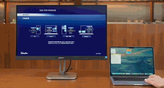 可以看到飞利浦27B2W5600显示器无需额外线材,通过无线即可覆盖日常使用设备,随时随地开启投屏模式,非常便利。