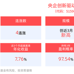 截至7月21日,央企创新驱动ETF近2年净值上涨10.42%。从收益能力看,截至2025年7月21日,央企创新驱动ETF自成立以来,最高单月回报为15.05%,最长连涨月数为5个月,最长连涨涨幅为24.91%,涨跌月数比为37/31,上涨月份平均收益率为3.97%,年盈利百分比为80.00%,历史持有3年盈利概率为97.54%。截至2025年7月21日,央企创新驱动ETF近3个月超越基准年化收益为7.76%。