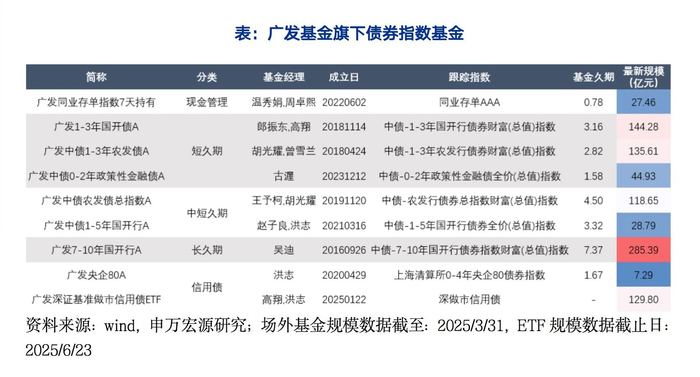 2019年之后,债券被动投资进入快速发展期,除了继续进行前沿性研究和布局,广发基金也在加快补全自己的指数债基版图。2019年,市场上的主流指数债基仍是久期分段指数。通过研究海外债券指数发展历程及调研国内客户,广发基金预判到:资产配置机构在不断成长的过程中,会逐渐减少通过频繁的久期择时增厚收益的行为,而更认可能够反映资产综合收益水平的产品。习惯于前瞻性布局的广发基金,再一次开创性地布局了全市场首只政金债全指基金——广发中债农发债总指数。该产品属于全指指数,覆盖短、中、长期等全期限政金债,具有三大优势:一是避免频繁久期调整的交易成本,二是通过广泛券种覆盖降低单一券种流动性风险,三是更能全面反映农发债市场整体收益。截至2025年6月30日,广发中债农发债总指数成立以来年化收益率为4.08%。成立于2021年的广发中债1-5年国开债指数基金,则是广发基金在中久期领域的“落子”,在其产品谱系中的定位是“承上启下”:对于保守型投资者,它是向长久期产品过渡的选择;对于进取型投资者,它是相较短久期产品的收益增强工具。截至2025年6月30日,该基金自成立以来的年化收益率为3.57%,最大回撤仅1.09%,超越了许多短久期基金。与此同时,广发基金持续以创新的姿态切入信用债指数基金赛道,全面覆盖了场外、深交所单市场和上交所单市场信用债券指数基金。例如,由基金经理洪志管理的投资级信用债指数广发央企80,是市场首只上清所央企信用债指数基金;其管理的广发深证基准做市信用债ETF,是市场首批基准做市信用债ETF及首批开展质押式回购的信用债ETF;而在今年7月快批快发的首批科创债中,广发科创债ETF名列其间,帮助广发基金在创新布局上再下一城。纵观广发基金旗下的债券指数产品布局,从2013年的中债金融债指数基金,到2016年的首批长久期政金债指数基金,2018年的短久期政金债指数基金,2019年的市场首只政金债全指基金,再到今年的两只信用债ETF创新品种,广发基金逐步实现从超短久期(0-2年)到长久期(7-10年)的全期限覆盖,在每一个细分赛道都有“落子”,在利率债、信用债、政金债等细分赛道均形成标杆产品,最终构建起业内领先的全谱系债券指数产品体系。