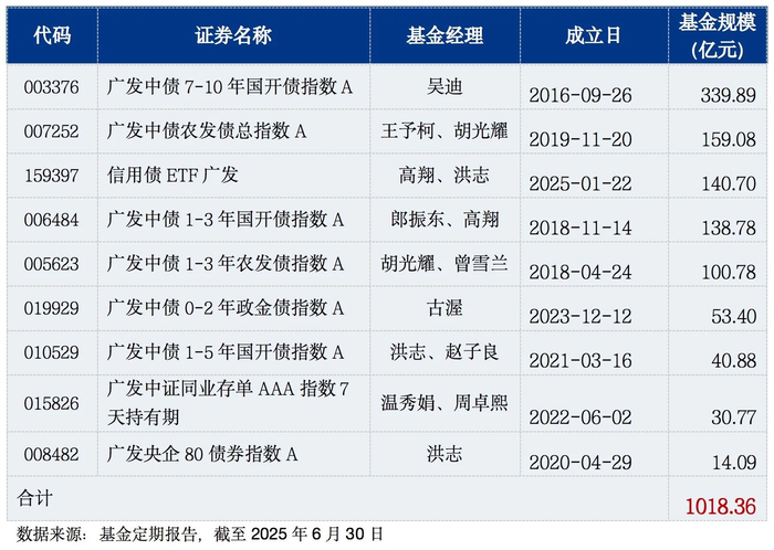 2013年,行业尚在起步阶段,广发基金以首只债券指数基金2亿元的规模悄然启航,一步步成长为债券指数基金的引领者。2025年二季度末,其旗下债券指数基金总规模正式突破 1000亿元,其中5只产品规模破百亿,成为全市场拥有百亿级债券指数基金最多的管理人。