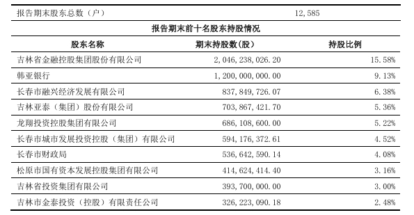 从股权方面来看,吉林银行整体呈现“国资主导+外资共舞”的特性。截至今年一季度末,该行第一大股东为吉林省金控集团,持股比例高达15.58%,;第二大股东为韩亚银行(韩国),目前持股9.13%,由吉林银行于2009年引入,曾以3.16亿美元入股并跃居最大股东之列。此外,吉林银行持股5%以上股权股东还包括长春市融兴经济发展公司、亚泰集团和龙翔投资控股集团。