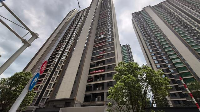 长沙润府小区内被破坏承重梁的楼栋挂着横幅。