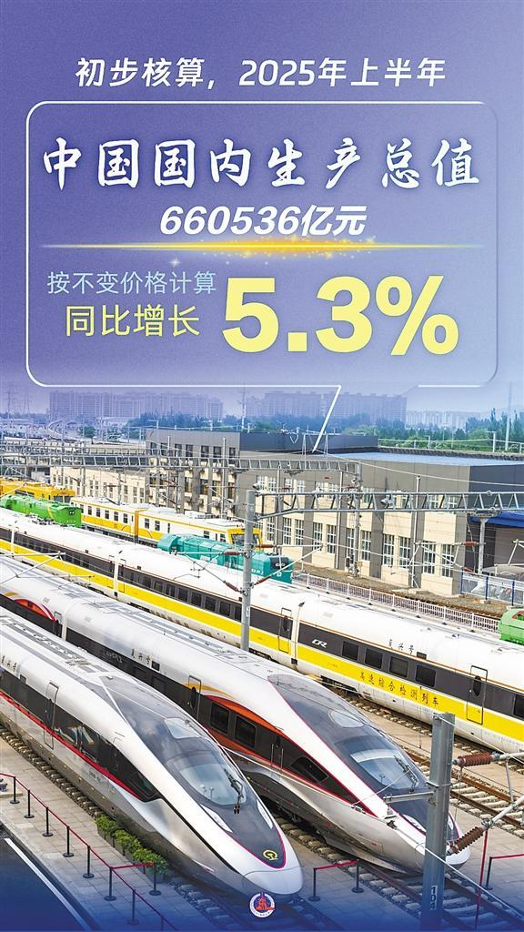 国家统计局发布数据,2025年上半年,国内生产总值660536亿元,按不变价格计算,同比增长5.3%。