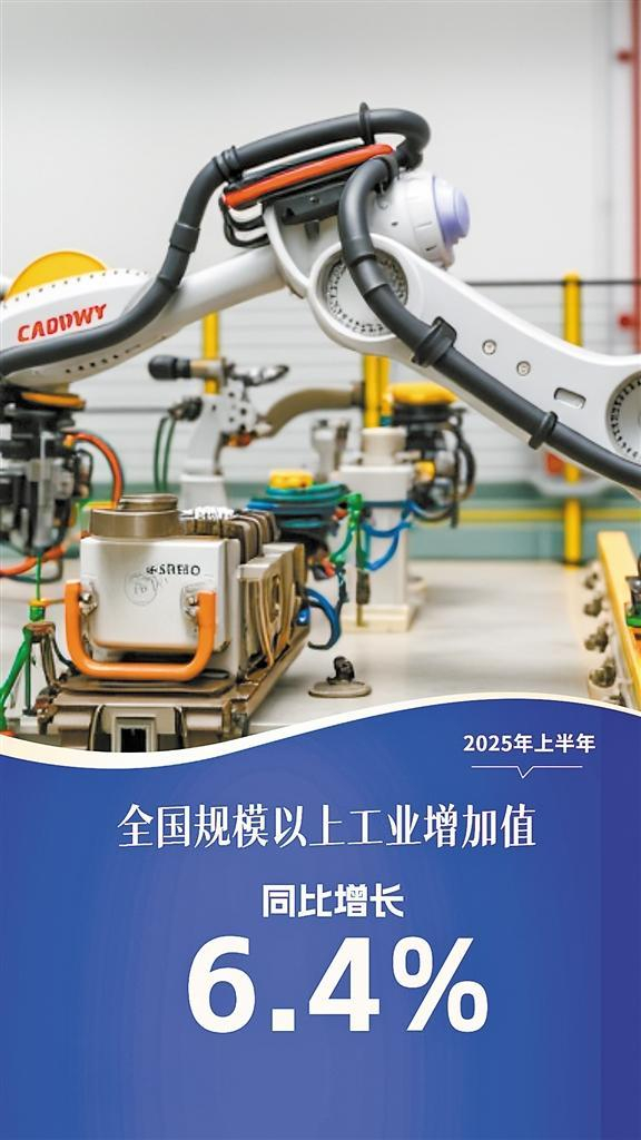 2025年上半年全国规模以上工业增加值同比增长6.4%,其中装备制造业增加值同比增长10.2%,高技术制造业增加值增长9.5%,增速分别快于全部规模以上工业3.8和3.1个百分点;服务业增加值同比增长5.5%,比一季度加快0.2个百分点。