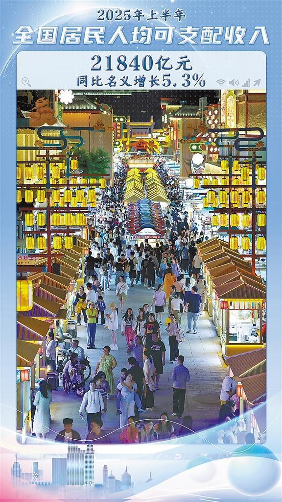 2025年上半年我国居民收入平稳增长。全国居民人均可支配收入21840元,同比名义增长5.3%,扣除价格因素实际增长5.4%。