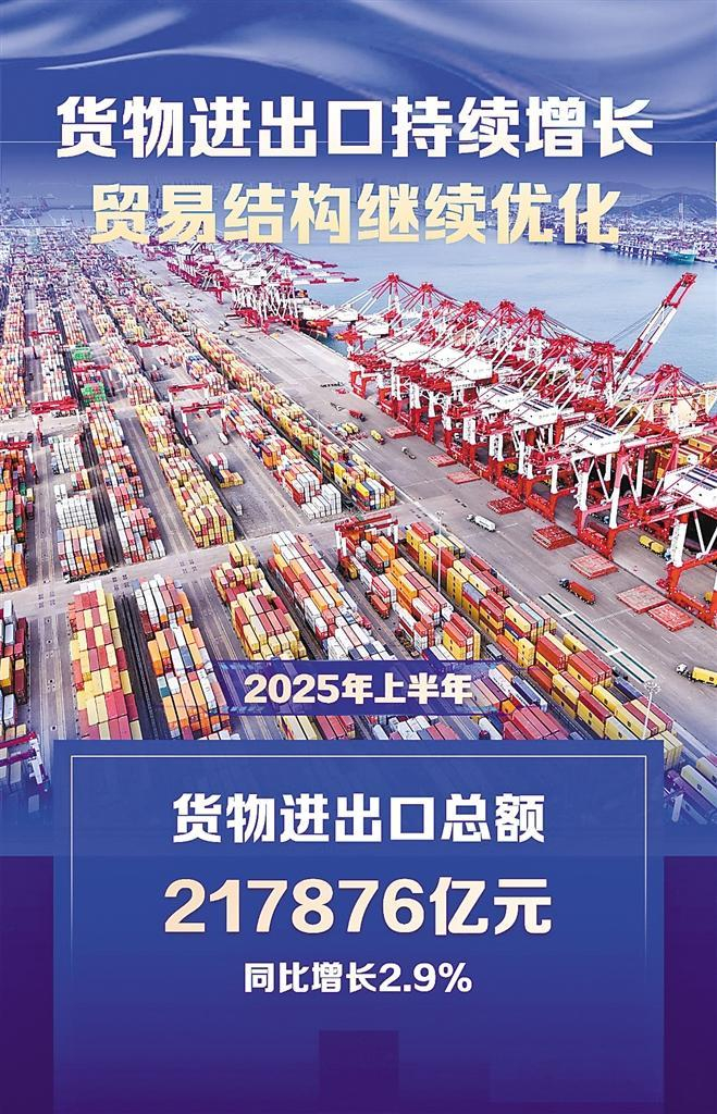 2025年上半年我国货物进出口持续增长,贸易结构继续优化。上半年,货物进出口总额217876亿元,同比增长2.9%。