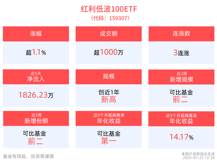 截至2025年7月22日 13:30,中证红利低波动100指数(930955)强势上涨1.26%,成分股隧道股份(600820)上涨10.07%,山西焦煤(000983)上涨10.07%,特变电工(600089)上涨9.98%,丽珠集团(000513),海螺水泥(600585)等个股跟涨。红利低波100ETF(159307)上涨1.19%, 冲击3连涨。最新价报1.1元。拉长时间看,截至2025年7月21日,红利低波100ETF近1周累计上涨0.37%。