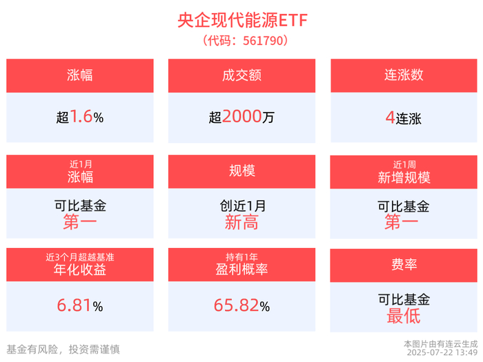 截至2025年7月22日 13:49,中证国新央企现代能源指数(932037)强势上涨2.11%,成分股中国能建(601868)上涨10.20%,中国电建(601669)上涨10.02%,东方电气(600875)上涨9.99%,大唐发电(601991),中国西电(601179)等个股跟涨。央企现代能源ETF(561790)一度涨超2%,现涨1.66%, 冲击4连涨。最新价报1.17元。拉长时间看,截至2025年7月21日,央企现代能源ETF近1周累计上涨4.08%,涨幅排名可比基金1/3。