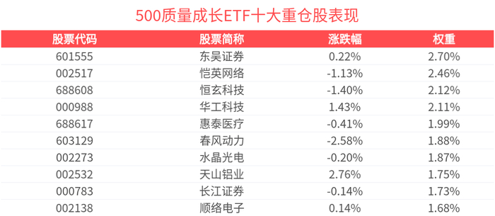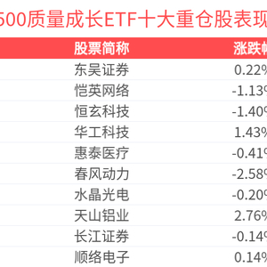 数据显示,截至2025年6月30日,中证500质量成长指数(930939)前十大权重股分别为东吴证券(601555)、恺英网络(002517)、华工科技(000988)、恒玄科技(688608)、惠泰医疗(688617)、春风动力(603129)、水晶光电(002273)、天山铝业(002532)、长江证券(000783)、顺络电子(002138),前十大权重股合计占比20.42%。