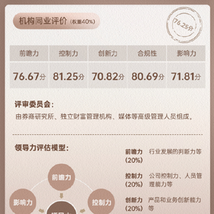 在同业评价方面,评审委员会由券商研究所、独立财富管理机构、媒体等高级管理人员组成,其中领导力评估模型包括前瞻力、控制力、创新力、合规性、影响力五大维度,评审委员对领军人物领导力能力进行打分(打分维度为1-10分),最终综合所有评分并进行百分制换算,最终得出同业评价总得分。