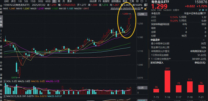 热门ETF方面,本轮(4.8-7.21)累涨27%的有色龙头ETF(159876)场内涨幅盘中上探1.8%,现涨1.72%,继续刷新年内高点(1.300元)。
