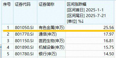 值得一提的是,有色金属板块成为当之无愧的行业涨幅王!截至7月21日,有色金属板块年内累计上涨25.56%,在31个申万一级行业中,涨幅断层第一!大幅跑赢通信(17.97%)、医药生物(16.81%)、机械设备(15.75%)、银行(14.50%)等行业。