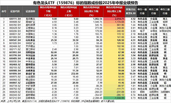 基本面上,截至7月20日,有色龙头ETF(159876)覆盖的60只有色金属行业龙头上市公司中,已有27家披露2025年中报业绩预告,其中22家预告盈利,占比超八成;22家预告净利润同比正增长,10家预告净利润预计翻倍增长,展现有色金属板块龙头公司经营韧性。其中,北方稀土预计上半年归母净利润同比预增1882%-2014%,霸居榜首!