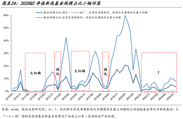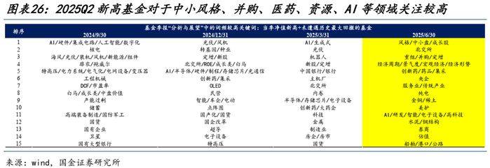 截至2025Q2,满足净值当季度创历史新高+未遭遇历史最大回撤的主动偏股基金的规模占比有所回落。对于满足条件的基金而言,一方面,从持仓来看,2025Q2新高基金相对配置了更多的通信、金融、医药等细分领域,同时低配了白酒、锂电等板块;另一方面,从基金季报中的“分析与展望”来看,二季度新高基金对于中小风格、并购、医药、资源、AI等领域关注较高。