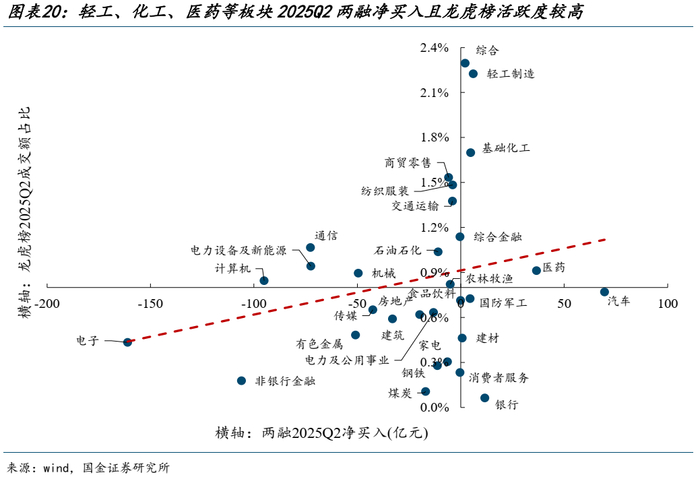 另一方面,虽然二季度个人投资者活跃度有所回落,但在轻工、医药、化工等领域以两融与龙虎榜(游资)为代表的投资者依然存在共识,即个人投资者与主动偏股基金可能在医药板块共识度较高,而轻工与化工等领域可能个人投资者是主要参与者之一。