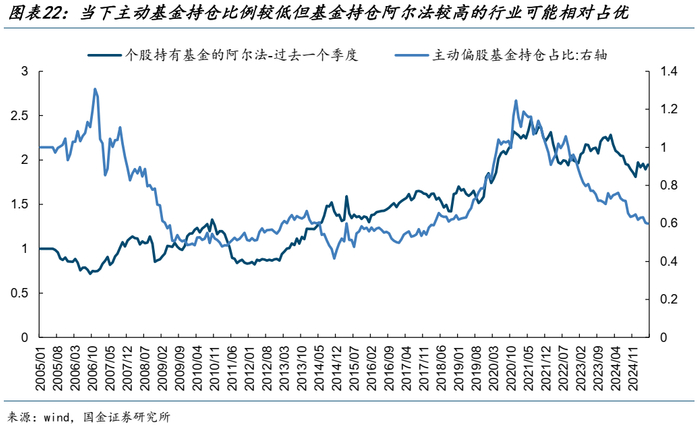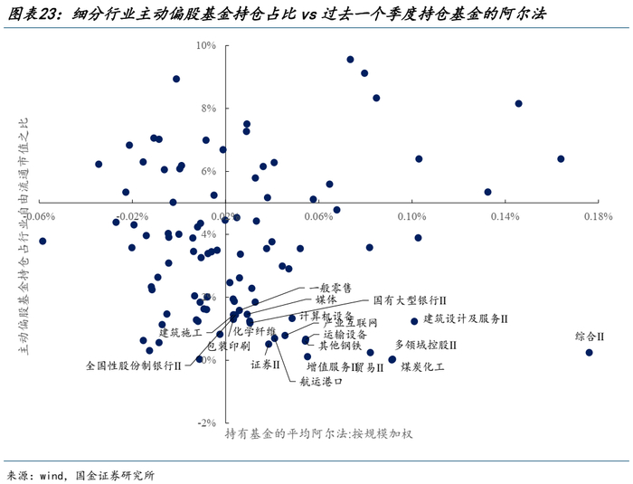 二是主动偏股基金持仓的资产可能存在反转特征:主动偏股基金持仓较高的行业可能在未来表现不佳,特别是考虑到当下主动基金资产端的共识往往是获得超额的来源之一。结合最新的情况看,当下主动偏股基金持仓比例较低但持仓的基金阿尔法较高的板块,可能相对占优,如:金融(银行、券商、保险)、建筑(施工与设计)、一般零售、计算机设备、运输设备、航运港口、化纤、煤化工、贸易、包装印刷等领域。