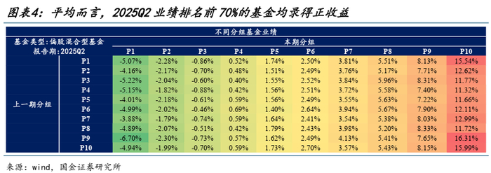 二季度主动偏股基金单季度收益率的中位数大约为1.8%,其中有超过50%的主动基金跑赢了其业绩基准,该比例相较于一季度的72%有所回落。更进一步,我们将每一期的主动偏股基金按照单季度业绩分为10组(P1、P2、…、P10,其中P1为业绩最差组,P10为业绩最好组)发现:二季度业绩排名前70%的主动偏股基金均录得不同程度的正回报。